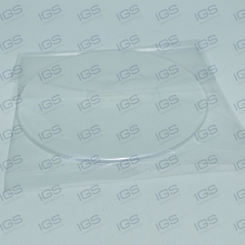 Placa circular plana em vidro de sílica fundida (quartzo transparente) com bordas lapidadas.