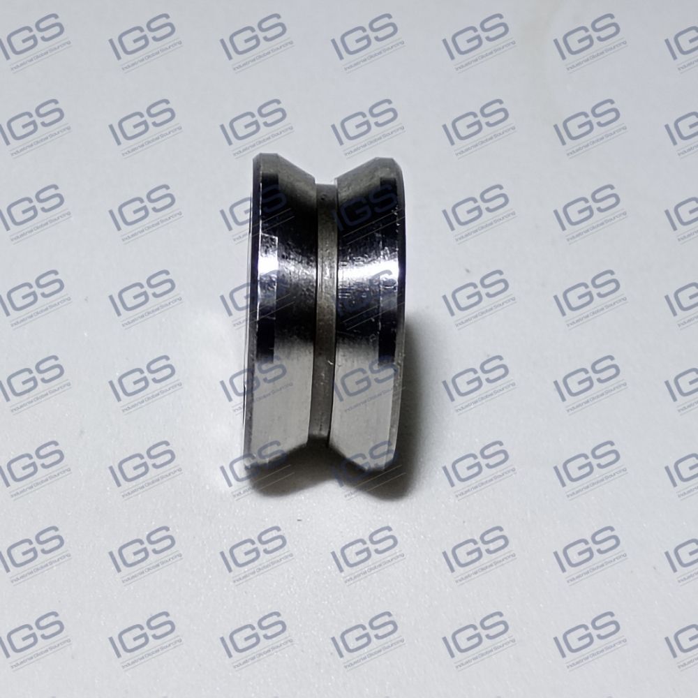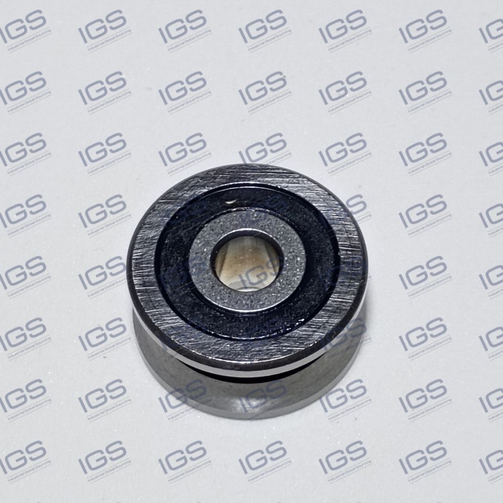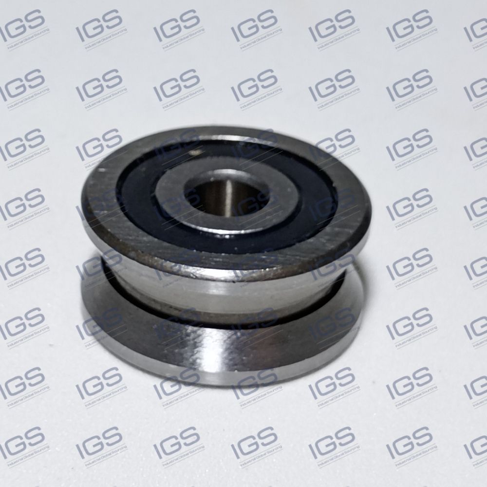 Roldana de guia linear com perfil externo em canal e rolamento de esferas integrado.